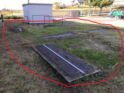 汚水タンクには穴や隙間【写真3枚目】がたくさん開いており、そこから臭いが出てきます。以前、市役所に「穴をふさぐことはできないのか?」という質問をしたことがあります。そのときは「中でガスが発生しているので、穴をふさぐことは危険なため、できない。」と回答をいただきました。それなら臭いを抑える策を講じてほしいなあとお願いしています。こればかりは学校の職員や保護者の力ではどうにもなりません。市に頼ります。