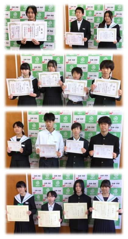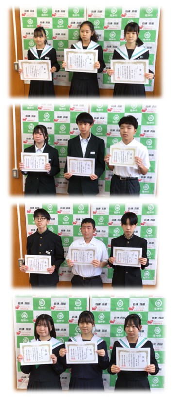 文化活動で表彰された生徒がこんなにたくさんいました。今年度から夏休みの探究課題を1つに絞り、読書感想文・作文・科学研究・調べる学習コンクールから選ぶ形にしました。