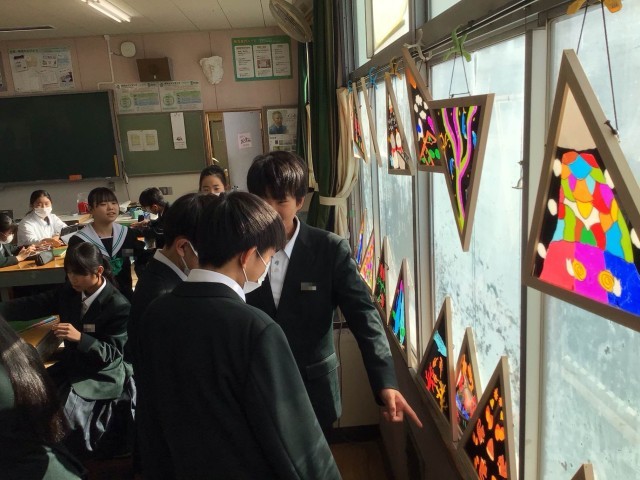 友達の作品の良さや美しさを伝え、本人からテーマや思いを聞きながら表現の工夫について確認をしました。花や葉の部分を二色でセロハンを貼り、光や影を工夫した表現は、一色よりも立体感があるなど、新しい見方や感じ方を共有しました。