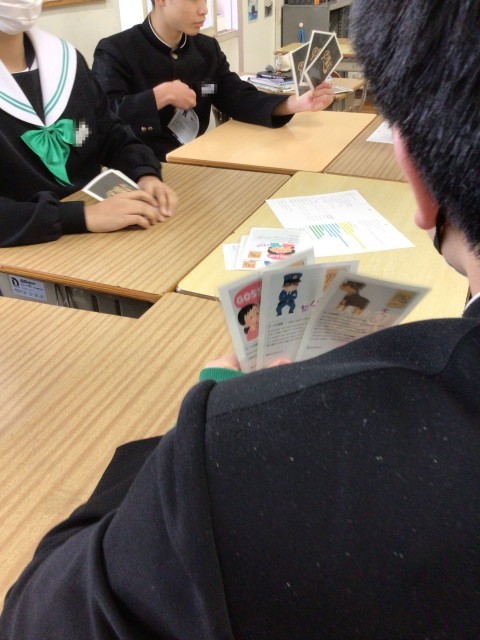 1限目は実際にゲームをプレイし、どんなことが言えるとゲームが楽しめるかを考えた。2限目の本時では、考えた表現を英語にしてみて、実際に英語でゲームをプレイした。なるべく教科書に出た既習の文法を活用するように指導したところ、let + 人 + 動詞の原形を活用して”Let me check your cards.”と言った表現を考えている様子が見られた。お試しで英語でプレイした時にもその表現を使っている様子があった。