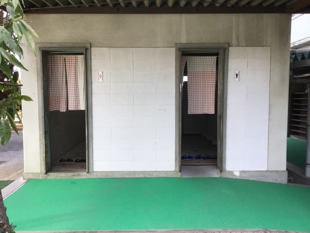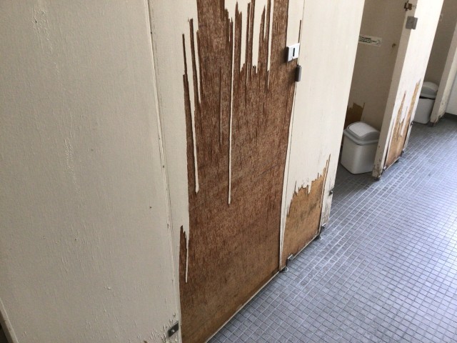 【写真上】今年度から改修予定だった旧式トイレ(扉もひどい)