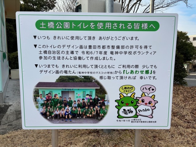 10月に実施した土橋公園トイレの塗り替えボランティアを記念して、活動パネルが設置されました。令和2年度に実施したトイレと同様に、トイレのそばに設置してあります。近くにお越しの際は、ぜひお立ち寄りください。