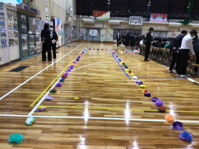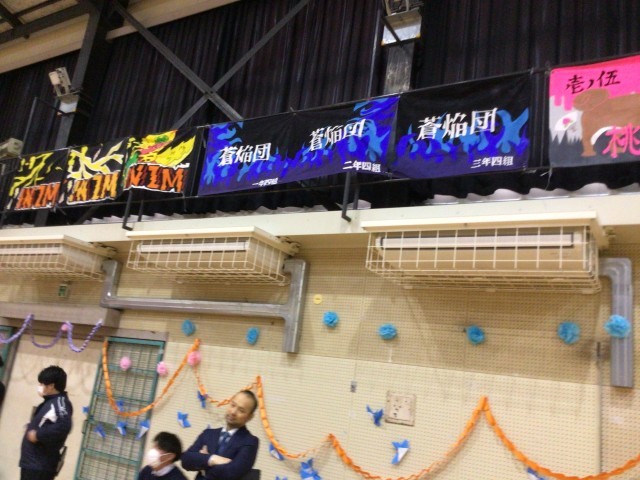 写真は、会場装飾の様子です。春夏秋冬の花を会場中に咲かせました。また、学年カラーである「青色」の鳥を体育館中に配置し、未来へはばたく様子を表現しました。