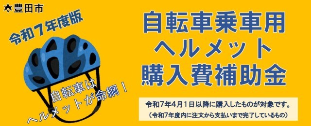 ヘルメット購入のための補助金のお知らせ 公開日 2026/03/03 更新日 2026/03/03 お知らせ 豊田市では自転車のヘルメットの購入費を補助してくれる制度があります。一人1個あたり上限2000円の補助です。ぜひお使いください。詳しい条件は以下のホームページでご確認ください。豊田市ホームページは→→こちらをクリックチラシは→→こちらをクリック