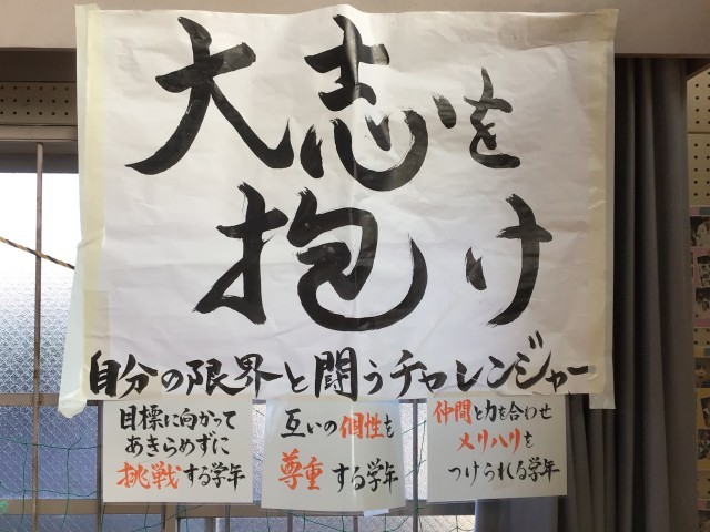 1年生のとき「大志Tシャツをどこの国で販売したら売れるか。」という社会の探究をしたね。熱心な話し合いに、読み応えのある振り返り、どれをとっても最高の授業でした。あのTシャツのように、大志をかかげた君たちへ、有名な「少年よ大志をいだけ」のセリフには、続きがあるんです。・・・君たちはきっと成し遂げられる。自分、人、そして社会のためになる生き方ができる。応援しています。