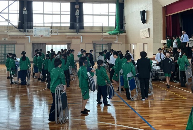 椅子をレールコンテナにしまう際には、「お願いします。」「お願いします。」・・・と、全生徒がさわやかに声をかけてバケツリレーならぬ椅子リレーをしてくれました。3年生のおかげで式の疲れがふっとびました。ありがとう。