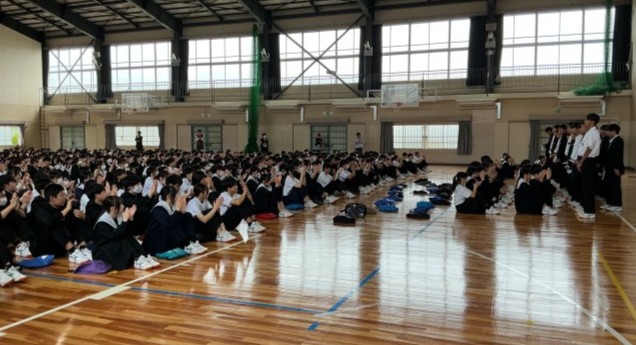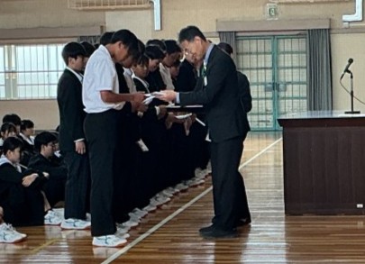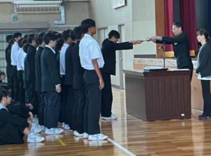 一人一人にメダルを渡し、さらに全校生徒から拍手をいただきました。いつ聞いても見ても竜神の拍手は一流です。相手がうれしくなる拍手をします。