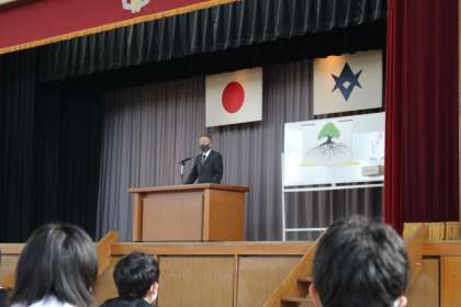 翌日(8日)に、2、3年生を集めて年度はじめの集会を開き、新しく仲間となる職員を紹介するとともに、新たな学校長として、「夢は大きく、根は深く」をキーワードに、イラストを交えて、生徒への願いを語りました。