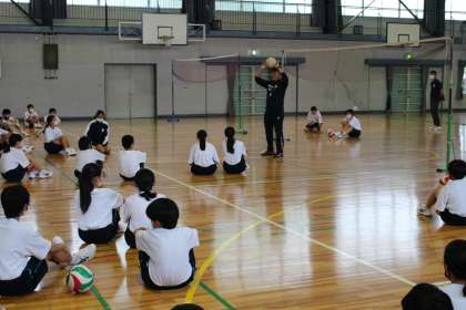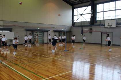 1年生の保健体育科の授業も2年生と同様にバレーボールを行っています。少しでも早くボールの下(正面)に入るという基本の動きを身に付けるために、ボールを使ったさまざまな練習がされていました。生徒たちみんなが楽しいそうに取り組んでいる姿が印象的でした。
