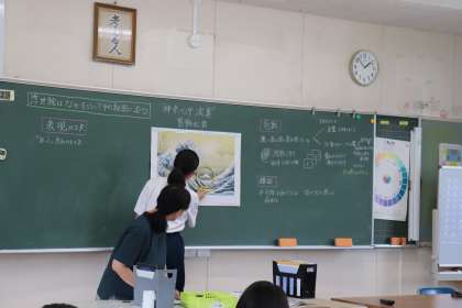 2年生の美術科の授業では、「浮世絵はなぜすごい?その秘密に迫ろう」という課題を設定し、葛飾北斎の「富嶽三十六景」を鑑賞しながら、「表現の工夫」「色彩」「構図」という3つの観点から意見を出し合いました。