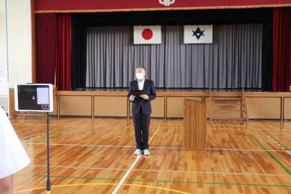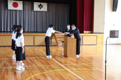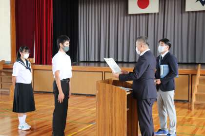 8日(月)の5時間目に、前期終了の節目に自分たちを振り返る機会として、切り替えの式を行いました。式の中で、後期生徒会の認証、各種表彰、校長先生からのお話がありました。