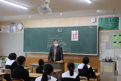 今日から1週間朝の猿中タイムで、校長先生が教室で生徒たちとの時間を過ごしています。今日は1年1組でした。