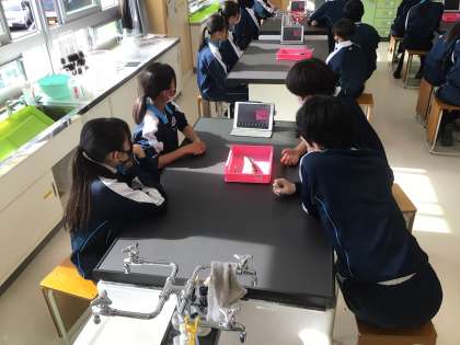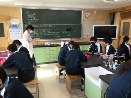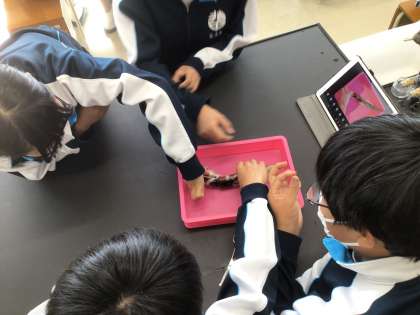 2年生の理科の授業の様子です。軟体動物の体のつくりを実物で観察しようということで、本物のイカを使って授業をしました。観察してほしい部分を学習用タブレットを活用して示していました。生徒は、興味をもって観察していました。