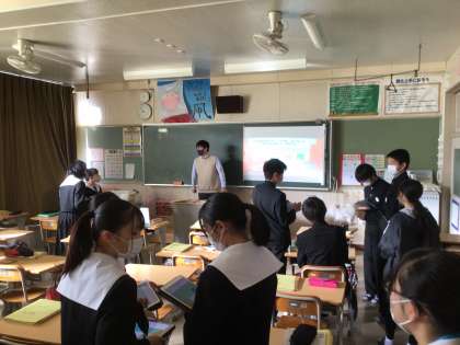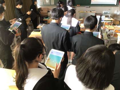 3年生の社会科の授業の様子です。地理の内容を学習用タブレットを活用して復習していました。チーム対抗とし、クイズ形式のため、生徒たちは相談しながら、全問正解をめざし取り組んでいました。