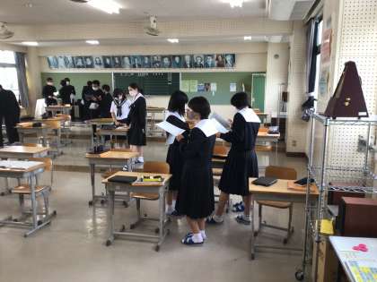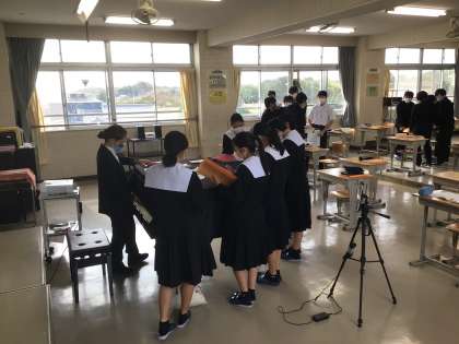 歌の練習をしています。感染対策をしながら、各パートに分かれて練習しています。クラスの仲間と歌うことができるのも、あと3か月くらいです。