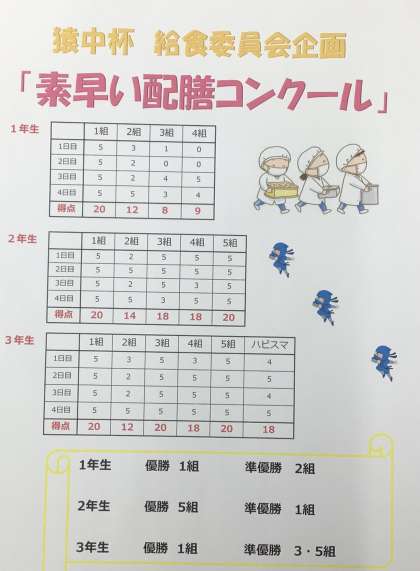 先週行われた給食委員会による「猿中杯」の結果です。どのクラスも、給食の配膳が早くなりました。工夫と協力によって、自分たちの生活をよりよいものにすることは、学校生活において大切なことです。今年も残り3週間ほどですが、日々前向きに学校生活を送りましょう。今週の「猿中杯」は、環境福祉委員会の担当です。