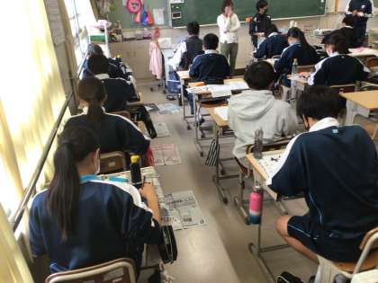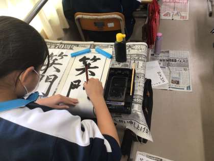 2年生の国語科の授業の様子です。書き初めの練習をしています。2年生は「笑門来福」の四文字を書きます。今週は、豊田書道連盟の方にも指導していただきます。どの生徒も上達できるように取り組んでいます。