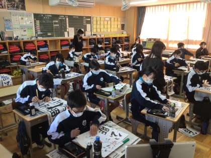1年生の国語科の授業の様子です。書道連盟の方の指導を受けながら、書き初めの練習をしています。