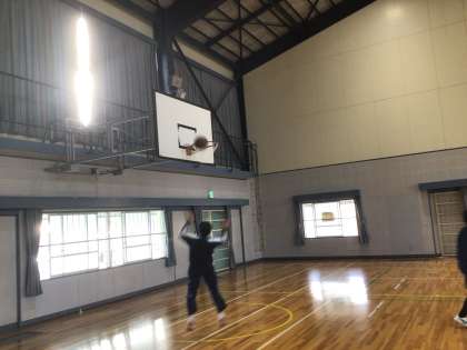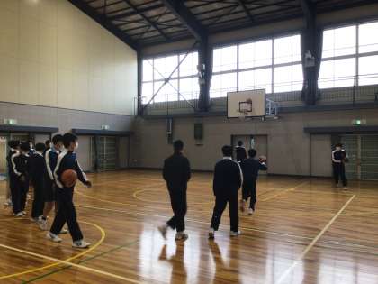 3年生の保健体育科の授業の様子です。バスケットボールに取り組んでいます。男女に分かれて、シュートをしています。何本連続してゴールできるか競っています。