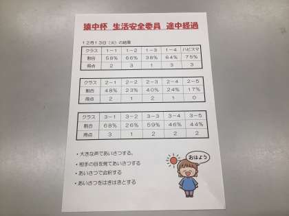 今週の猿中杯は、生活安全委員会が担当しています。学校生活をよりよいものにするために「朝のあいさつ」を大切にしています。昨日の様子が表にまとめられています。