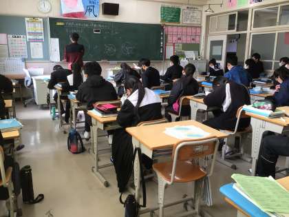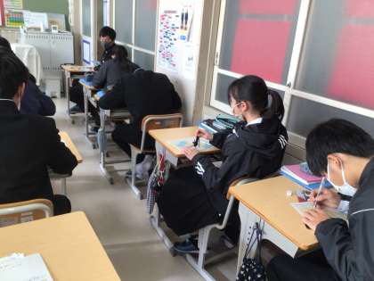3年生の数学科の授業の様子です。円の性質を利用して、さまざまな問題に挑戦しています。仲間と相談しながら、解いていました。
