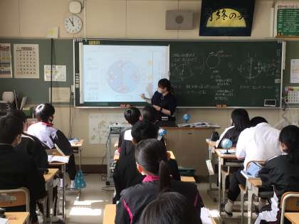3年生の理科の授業の様子です。地球の運動と季節の変化について学習しています。今日は、ミニ地球儀を使って学びを深めていました。