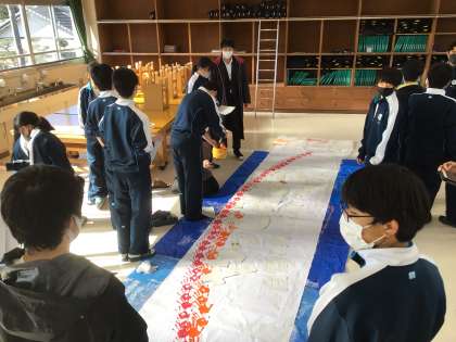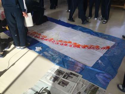 自然教室に向けて準備を進めています。横断幕作りの様子です。生徒が手形をつけていました。限られたを有効に活用して、準備を進めています。
