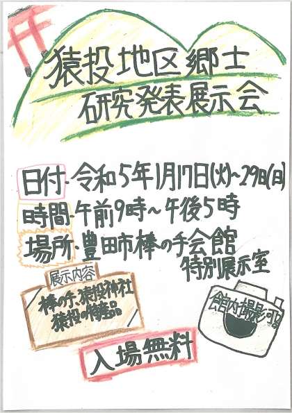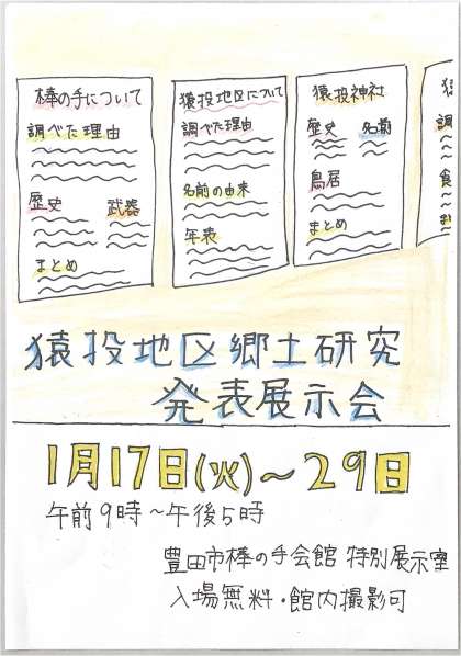 1年生の総合的な学習の時間で「地域調べ」に取り組んできました。そのまとめを豊田市棒の手会館にて展示しています。期間は、今月の29日(日)までです。