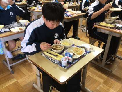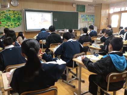 1年生の給食の様子です。今週は、学校給食週間(〜30日)です。本校は、栄養教諭が勤務していますので、北部給食センターの調理の様子を映像で紹介しながら説明をしていました。今日は、味噌ラーメンでした。メニューも時代に合わせて変化しています。