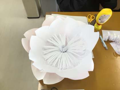 会場を華やかにする飾りを制作しています。立体的な飾りにするために、工夫をしながら進めています。