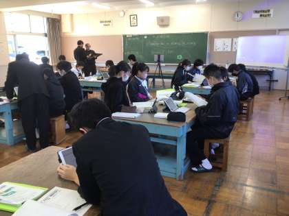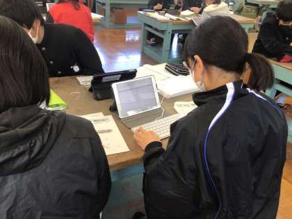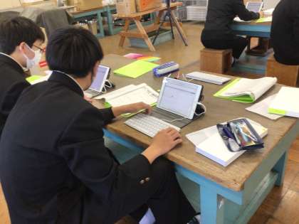 2年生の技術科の授業の様子です。プログラミングの学習をしています。生徒はプログラム通りに画面上のイラストが動くかどうか確認していました。
