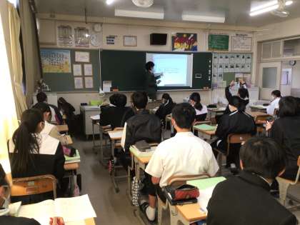 2年生の理科の授業の様子です。昨日実施した「学習診断テスト」の解説をしています。学習用タブレットを活用して説明をしていました。