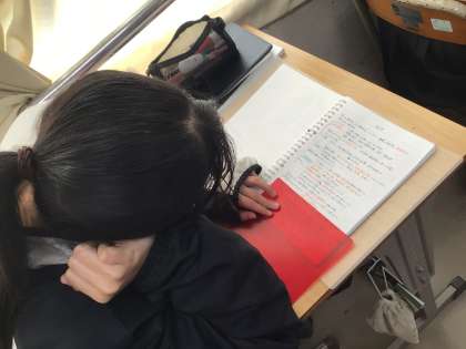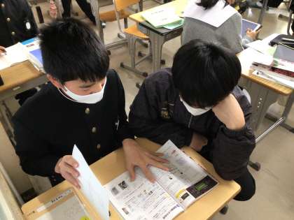 2年生の様子です。明日から始まる「学年末テスト」に向けて、学習しています。仲間と教え合う姿も見られます。