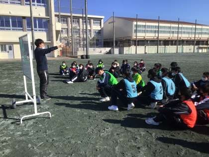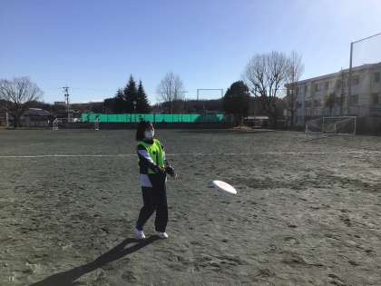 2年生の保健体育科の授業の様子です。アルティメットをしています。1時間目の運動場での授業はとても寒いですが、生徒は前向きに取り組んでいました。保健体育科の授業では、学生ボランティアの方に協力していただき、一緒に活動することもあります。今日は学生ボランティアも参加していました。