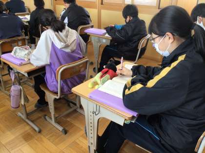 1年生の国語科の授業の様子です。「少年の日の思い出」の話について、内容から3つに分ける作業をしていました。朗読を聞きながら取り組んでいました。