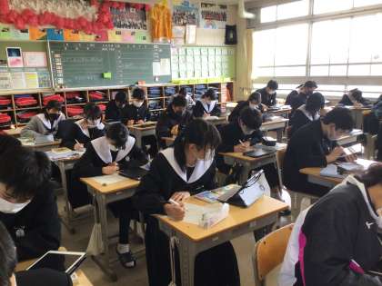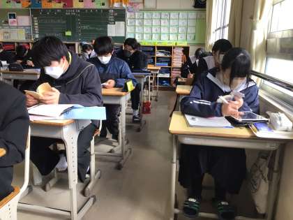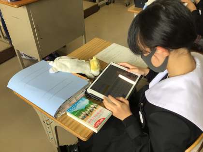 2年生の国語科の授業の様子です。ビブリオバトルの準備をしていました。本のどういう場面の紹介をするのか、作戦を考えていました。