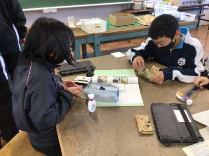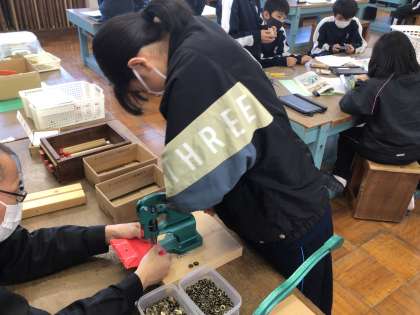 1年生の技術・家庭科の授業の様子です。廃材(廃段ボール)を使って、小物入れ(財布)を作っています。力が必要な作業もありますが、ものづくりに集中していました。