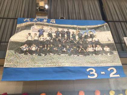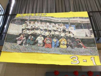 モザイクアートを飾っています。1,2年生が協力して作りました。