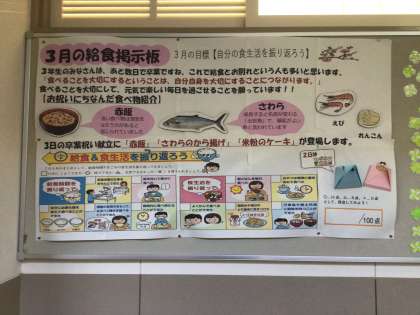 3月になりました。給食の掲示板です。3年生の皆さんがもうすぐ卒業をします。日本のお祝いにちなんだ食べ物が紹介されています。