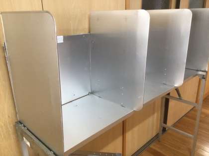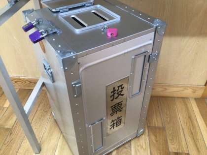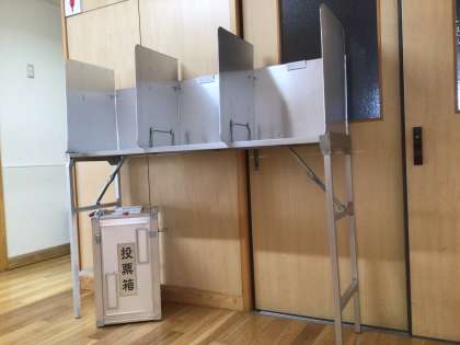 来週に行われる生徒会役員選挙のために、生徒会担当の先生が、豊田市選挙管理委員会から借りてきました。実際の選挙で使用していたものです。1,2年生の廊下に置いています。