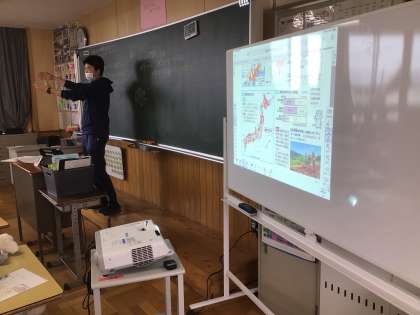 1年生の社会科の授業の様子です。日本の地理について学んでいます。今日は、過密と過疎のメリットとデメリットについて話し合っていました。