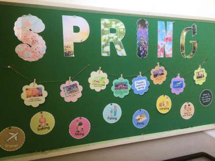 校内には、さまざまな掲示がされています。これは、英語科の掲示板です。「春」に関する内容です。