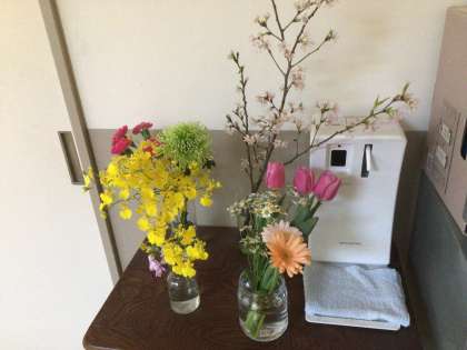 保健室の出入り口に飾ってあります。桜の花は、切り花用で販売されていたものです。「東海桜」だそうです。