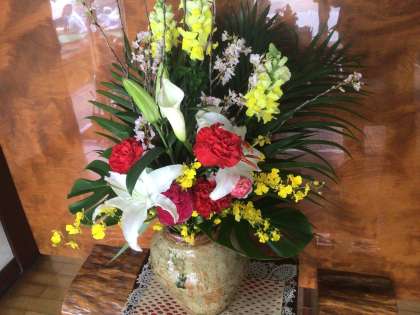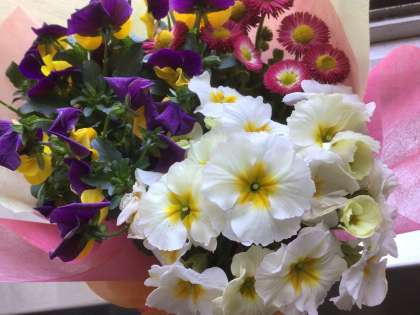 卒業式で飾った花を校内の至る所に飾っています。校内の廊下には、花の香りがして、心地よい気持ちになります。公務手さんが手入れしています。