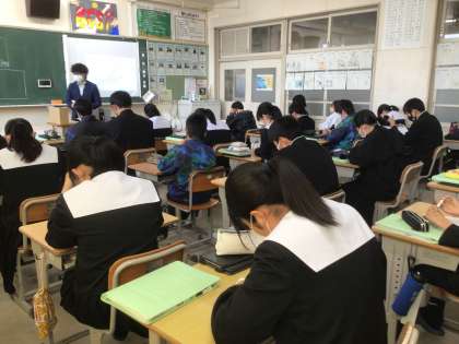 2年生の理科の授業の様子です。授業の最初に、復習プリントに取り組んでいました。