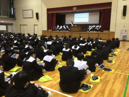 令和5年度前期生徒会役員選挙の立会演説会が行われました。立候補者の取り組みたいことをまとめたパンフレットを学習用タブレットで配信したり、演説会ではプロジェクターを活用したりと、令和らしい工夫がされていました。