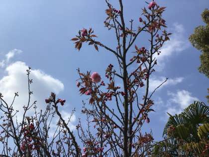 体育館北側の駐輪場の近くに咲いていました。八重桜です。種類は関山桜かなと思います。これから、満開を迎えることになりそうです。入学式・始業式の日には、まだ満開ではないかもしれません。