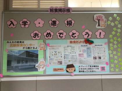 保健室前の掲示板です。保健室からの連絡と給食の連絡が掲示されます。早速、給食からの掲示がされています。