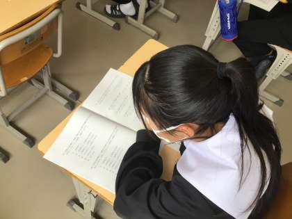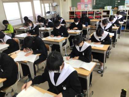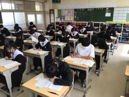 3年生は、午前中、全国学力・学習状況調査を実施しました。国語科、数学科、英語科の学力検査と生活や学習についてのアンケートに取り組みました。アンケートに取り組んでいる様子です。