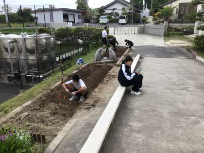 校内の畑の畝づくりをしていました。水分補給をしながら、作業を進めていました。